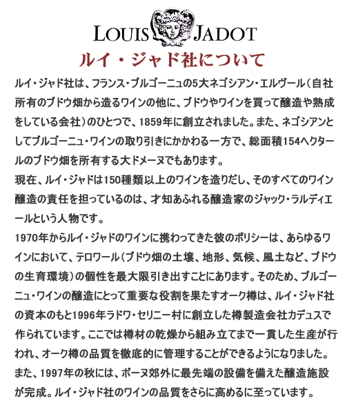ルイ・ジャド シャブリ“セリエ・ド・ラ・サブリエール”(白) 生産国:フランス 蔵元:ルイ・ジャド 生産地:ブルゴーニュ地方 種類:白 内容量:750mL 品種:シャルドネ100% ワインコミック「神の雫」第3巻、ドラマの第1話に登場したワインです。